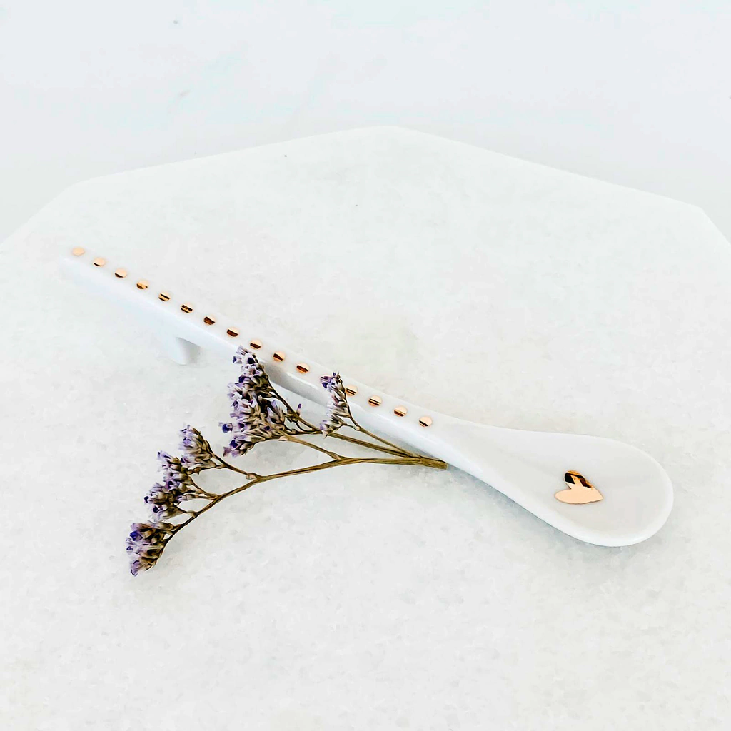 Essa peça super charmosa em porcelana, com estampa de poá e coração ouro, tem ainda um detalhe na parte posterior, que permite apoiá-la na xícara, caneca ou sobre a mesa.