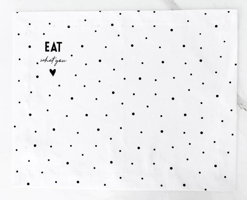 Confeccionado em tecido diferenciado, com toque macio, esse jogo americano com estampa de poá e a frase Eat What You Love, vai deixar sua mesa linda de viver e tornar mais especial, a hora de servir as suas delícias favoritas.
