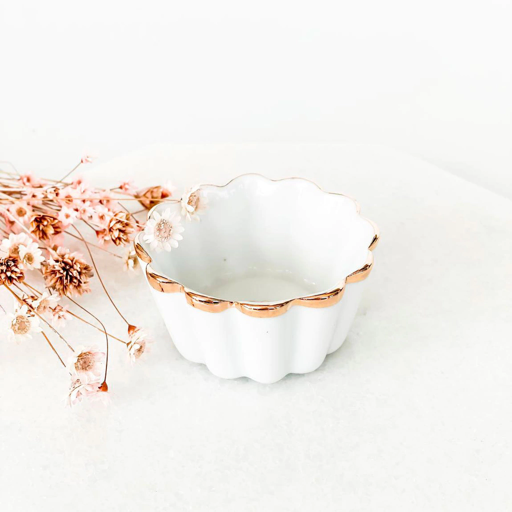 Aposte nesse mini bowl no estilo forminha, com estampa de coração e filete ouro, pra trazer um toque de charme e sofisticação pra sua mesa posta. Essa peça é perfeita para sevir doces, geléias, molhos, patês ou manteiga.